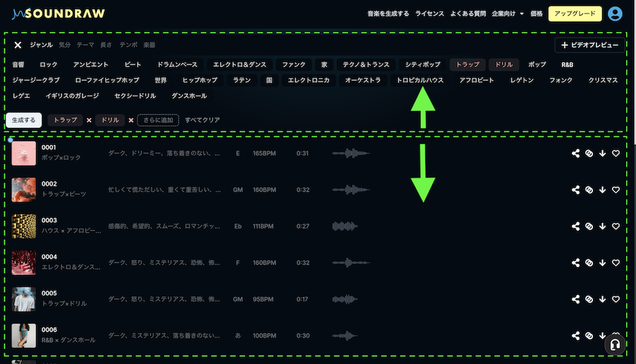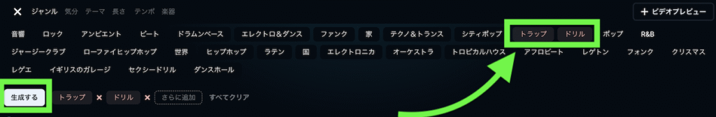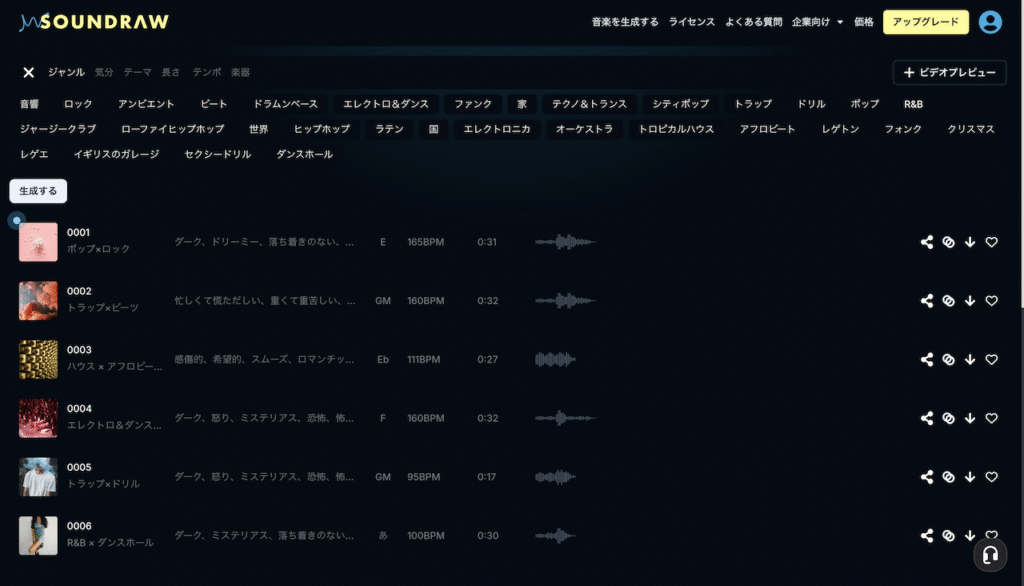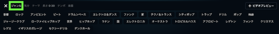 様々な音楽ジャンルの楽曲が元から生成されており、自分の気になる音楽ジャンルが直感的に探せるようになっています。