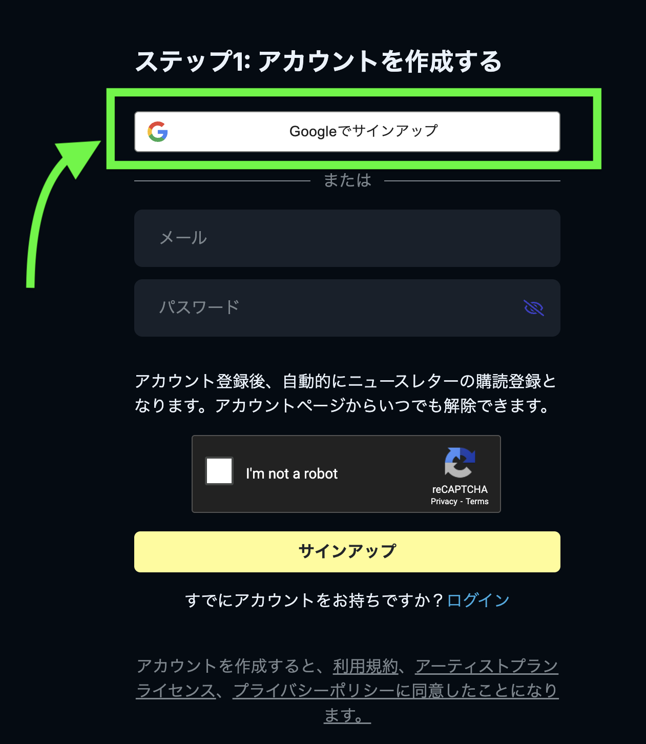画面右上の「サインアップ」をクリックして、新しいアカウントを作成しましょう。