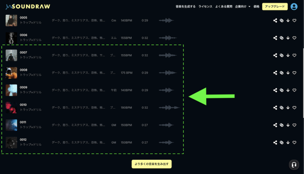 また、「より多くの音楽を生み出す」ボタンを押すと、6つの楽曲(0007~0012)を追加で生成することができます↓
