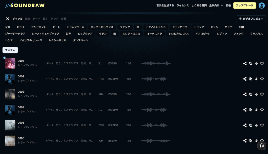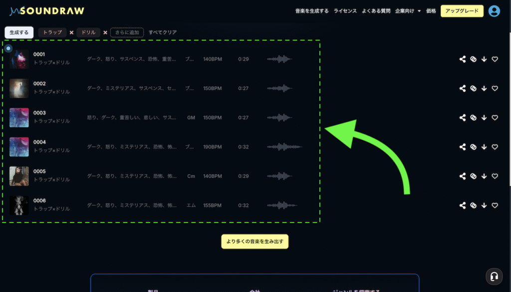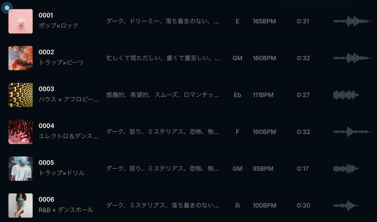 「作成する」ボタンを押すとすぐに、ジャンル選択箇所の下側に楽曲が出力されます↓