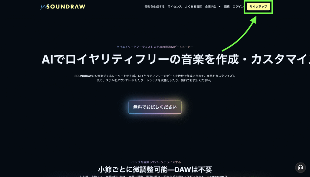 「Soundraw」のWebサイトを開くと、以下の画面が表示されます↓